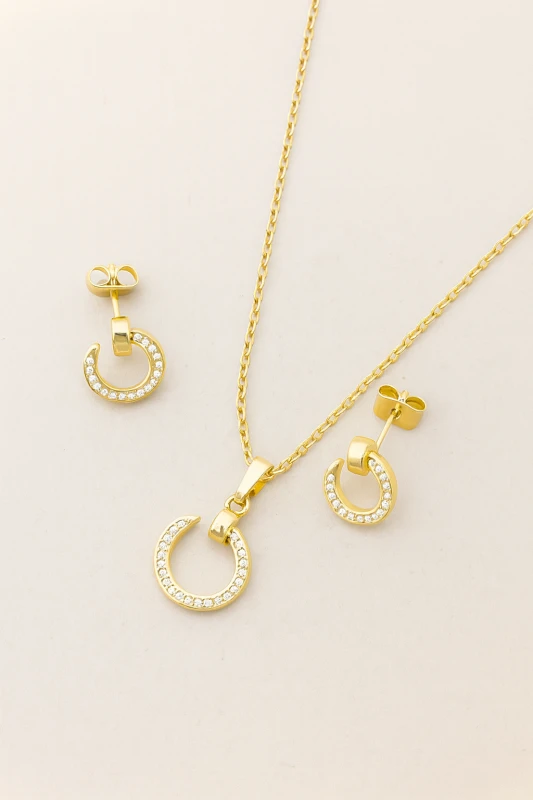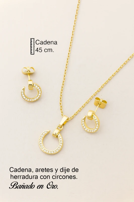 Los aretes replican el motivo semicircular del dije, manteniendo proporción y continuidad estética. Su tamaño reducido y su fijación segura permiten un ajuste cómodo al lóbulo, asegurando estabilidad durante el uso prolongado. El acabado dorado pulido refuerza la lectura de lujo discreto y facilita la versatilidad del conjunto para distintos contextos de uso.
