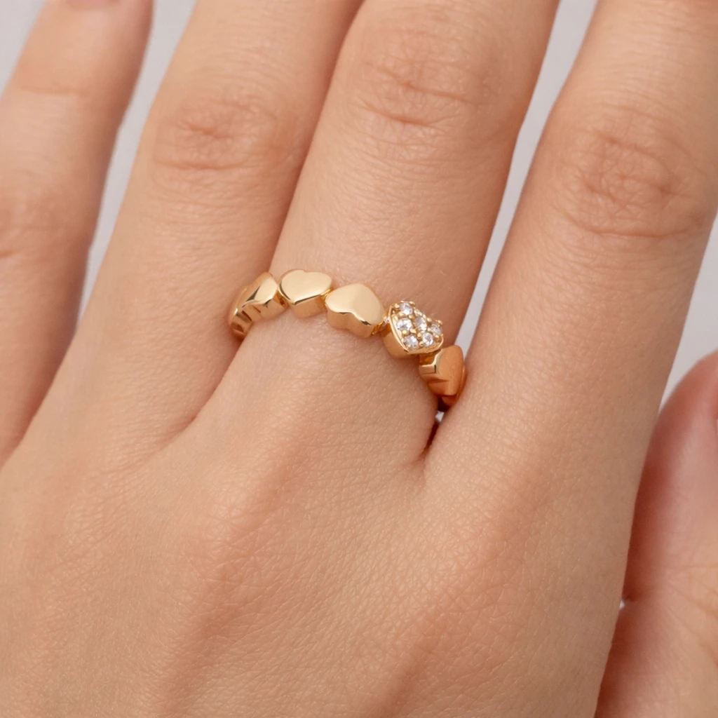 Este anillo presenta un diseño de carácter romántico–contemporáneo, donde la repetición modular de formas de corazón constituye el eje compositivo de la pieza. El aro está conformado por una secuencia de volúmenes pulidos en forma de corazón, articulados de manera continua, generando un ritmo visual uniforme y una lectura simbólica asociada al afecto, la unión y la feminidad