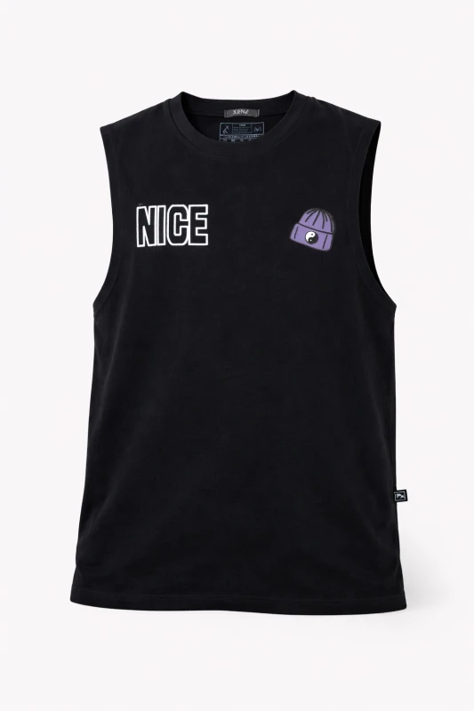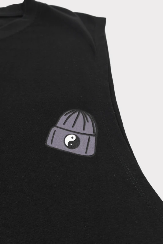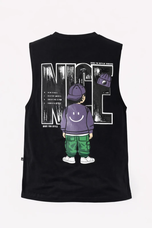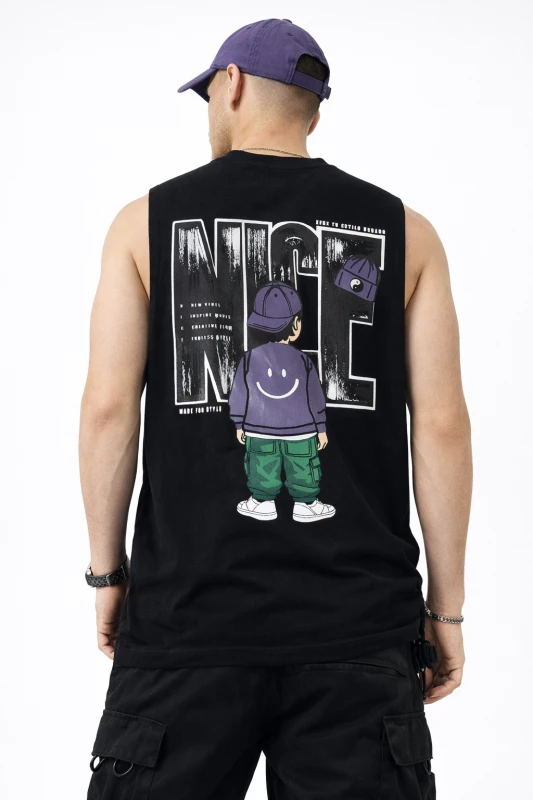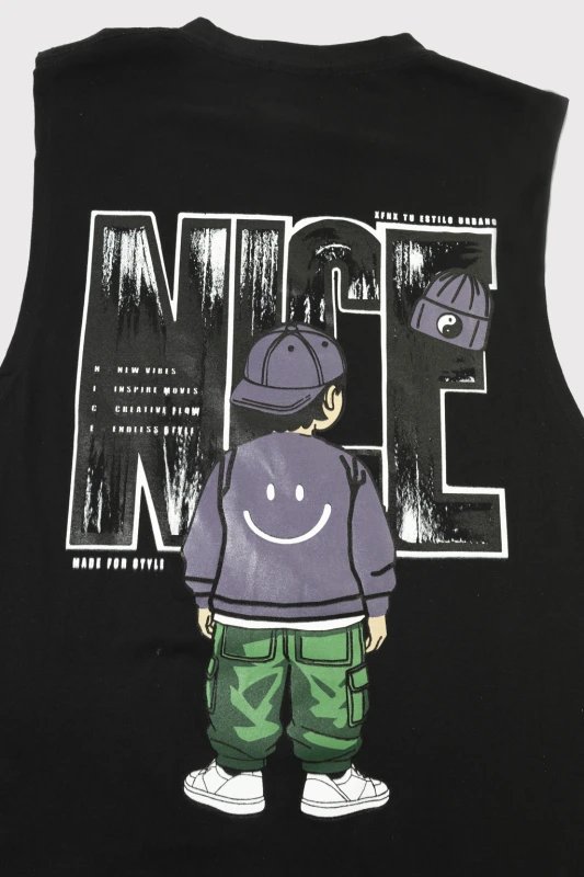 Camiseta sin mangas de estilo urbano en color negro, diseñada para quienes buscan un look moderno y desenfadado. Presenta un estampado gráfico llamativo en la parte trasera, con ilustración y tipografía de gran tamaño que aportan personalidad y estilo streetwear. Su corte recto y cómodo la hace perfecta para el uso diario, actividades casuales o outfits relajados, combinando fácilmente con jeans o pantalones cargo.