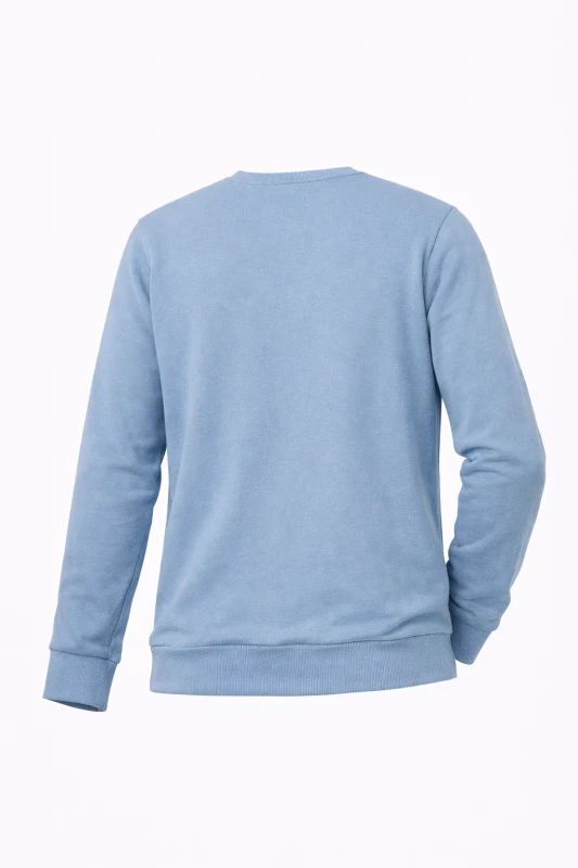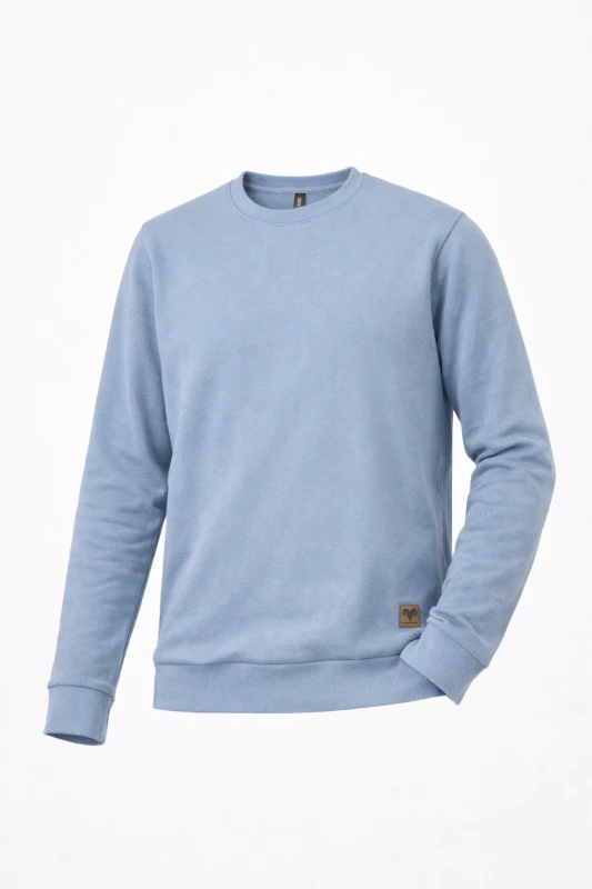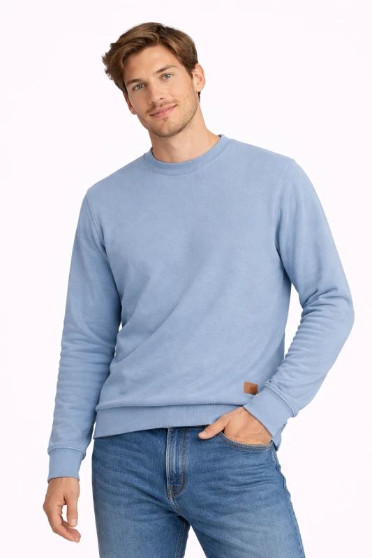Sudadera básica de cuello redondo para hombre en un tono azul claro, perfecta para un estilo casual, fresco y moderno. Su diseño minimalista y limpio la convierte en una prenda esencial para el día a día, aportando comodidad sin perder estética. La silueta equilibrada permite que se adapte al cuerpo de forma natural, mientras que su acabado suave la hace ideal para usar sola o en combinación con otras capas. Es una opción versátil para climas templados o frescos.