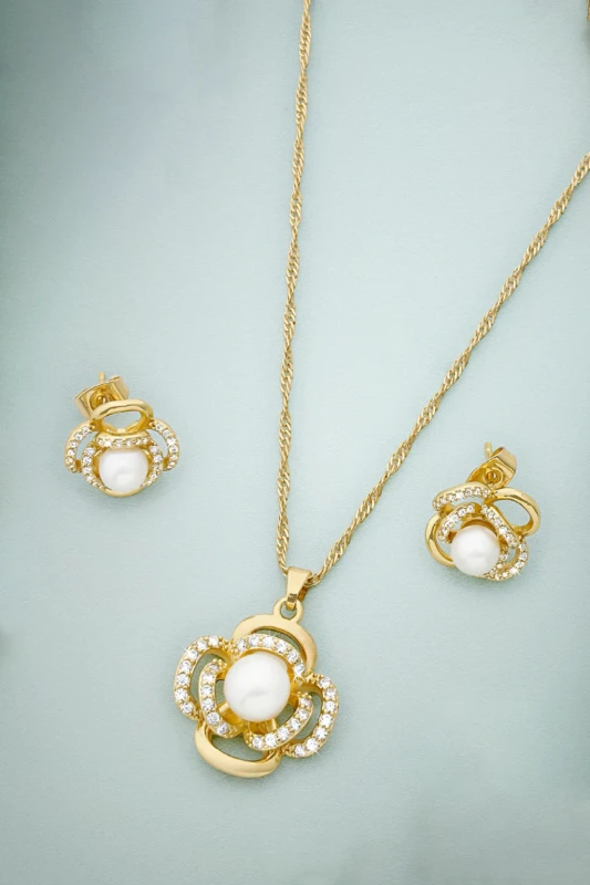 Este elegante set de joyería combina sofisticación y brillo en un diseño armónico. El conjunto incluye un collar con cadena dorada y un dije ornamentado, acompañado de un par de aretes a juego. Cada pieza destaca por una perla central de acabado suave y luminoso, rodeada por un delicado marco dorado adornado con brillantes cristales que añaden un toque de lujo. Su estética clásica y refinada lo convierte en un accesorio ideal para ocasiones especiales, eventos formales o para complementar atuendos elegantes con un toque distinguido y femenino.