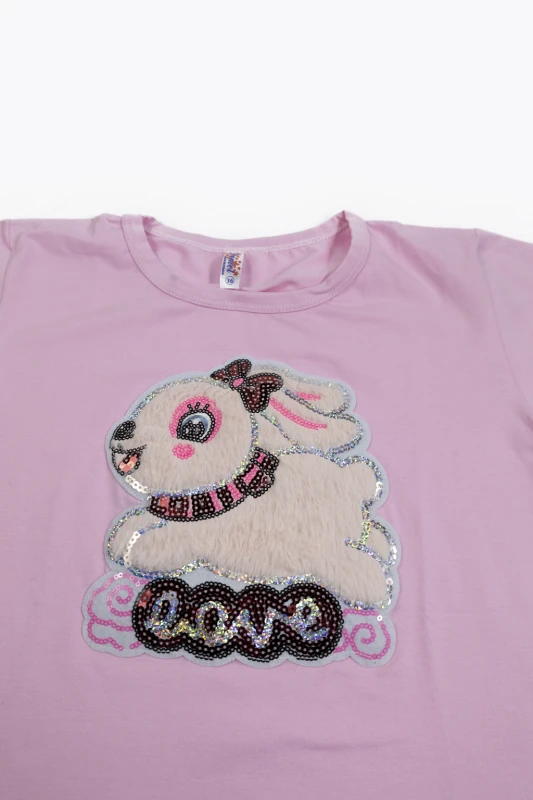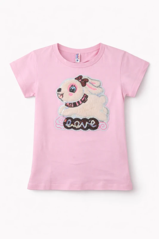 Esta camiseta infantil rosada con diseño de conejito con lentejuelas es perfecta para niñas que aman la ropa tierna y brillante. Su estampado con detalles decorativos le da un estilo divertido y moderno, ideal para el uso diario, salidas o reuniones familiares. Está confeccionada con tela suave y cómoda que permite libertad de movimiento y frescura durante todo el día.