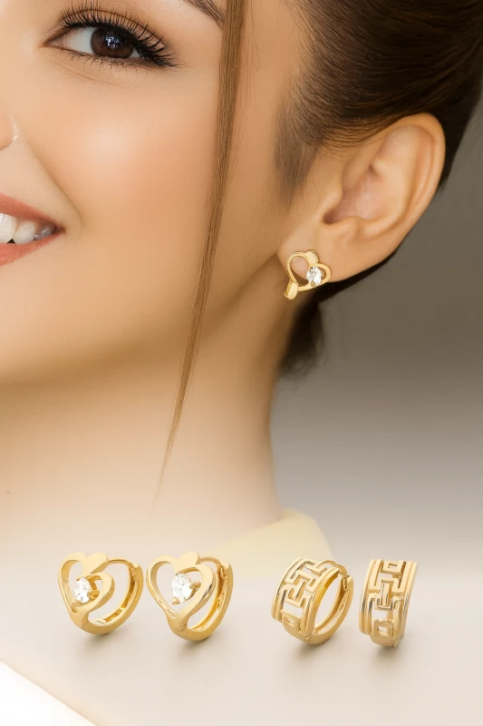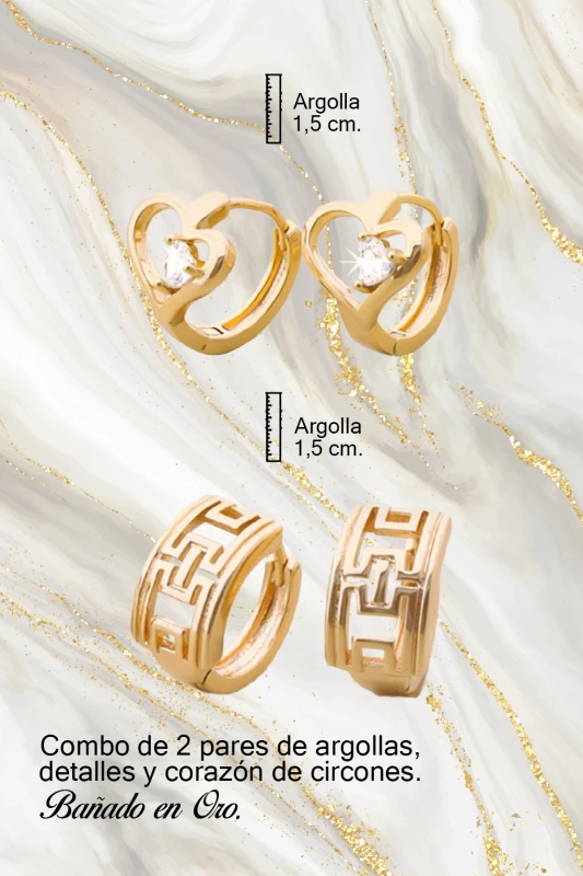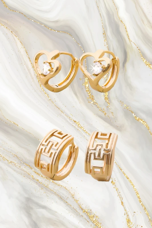 El segundo par corresponde a aretes tipo argolla corta con un diseño geométrico de inspiración greca/laberinto, caracterizado por líneas rectas, repetición modular y relieve controlado. El acabado dorado pulido potencia los contrastes de luz y sombra generados por el relieve.