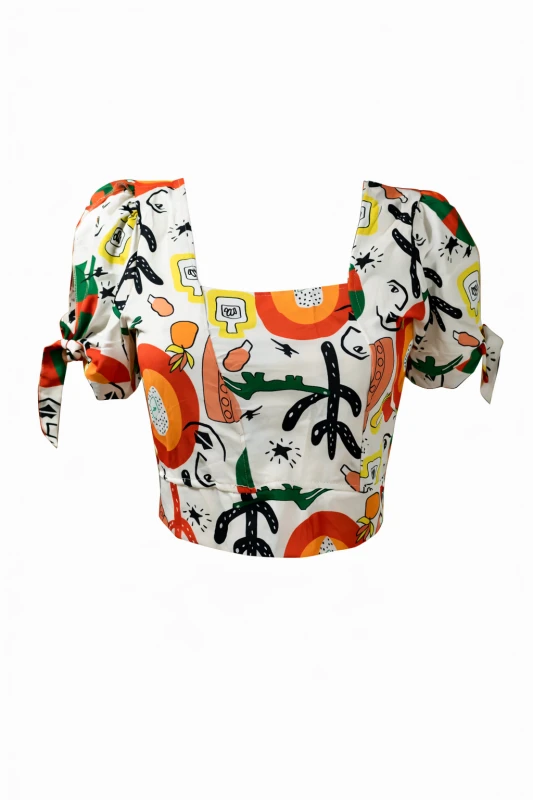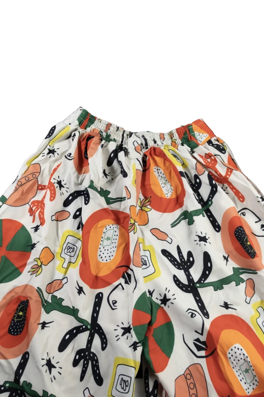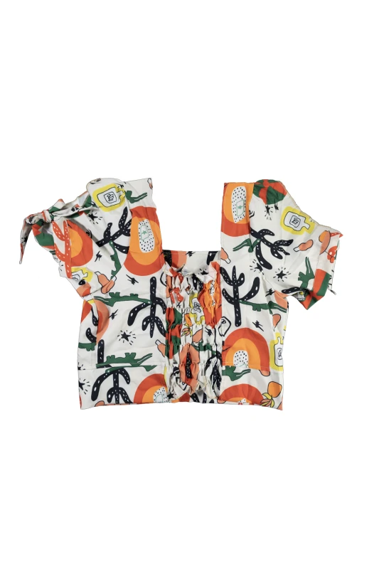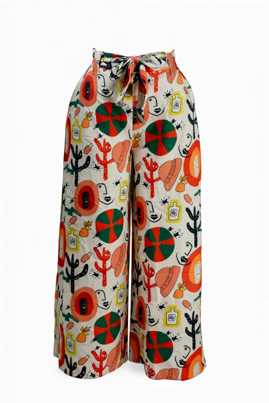 Luce fresca, femenina y con un estilo auténtico con este conjunto de dos piezas de inspiración tropical. Su estampado vibrante con figuras orgánicas y colores cálidos sobre fondo claro crea un equilibrio perfecto entre elegancia y alegría. El diseño combina una blusa de corte favorecedor con pantalón de pierna amplia, ideal para estilizar la figura mientras mantiene máxima comodidad.