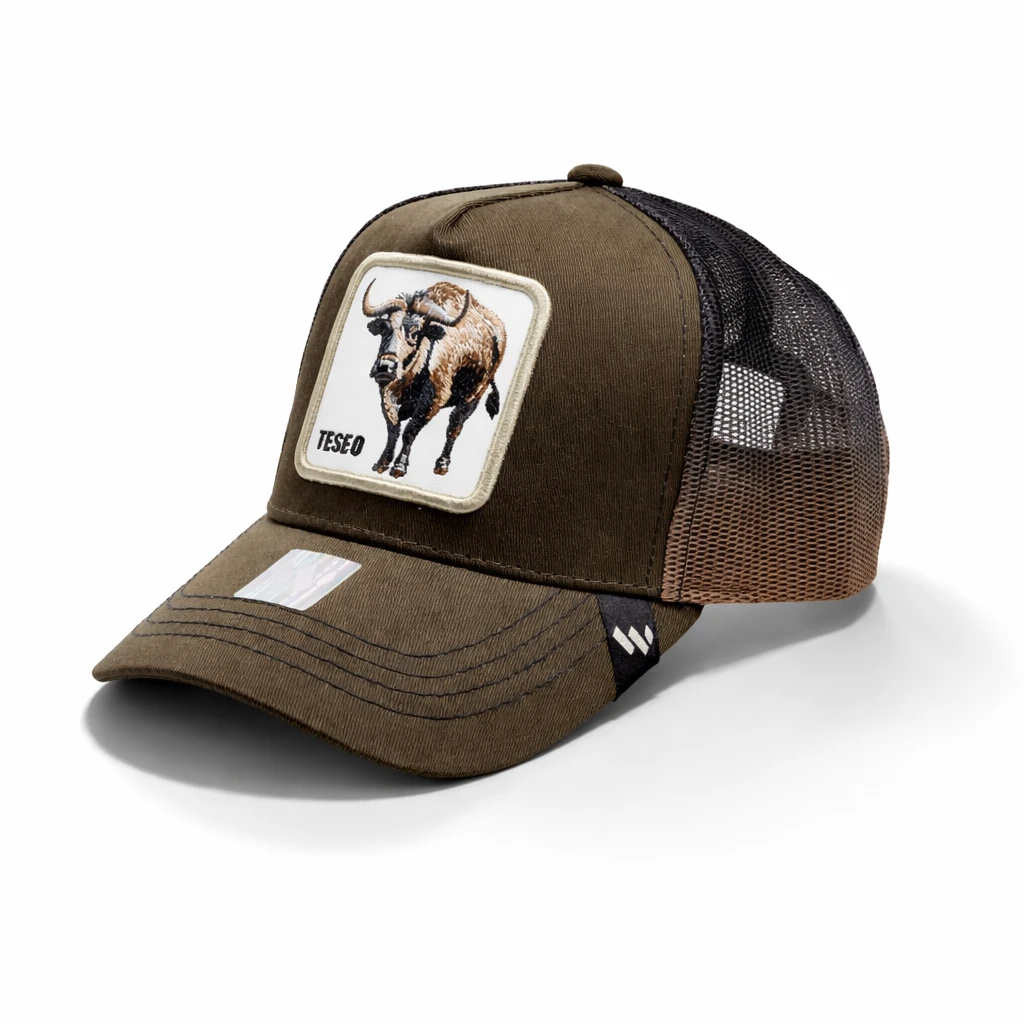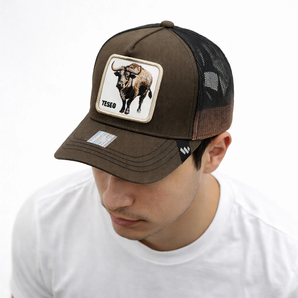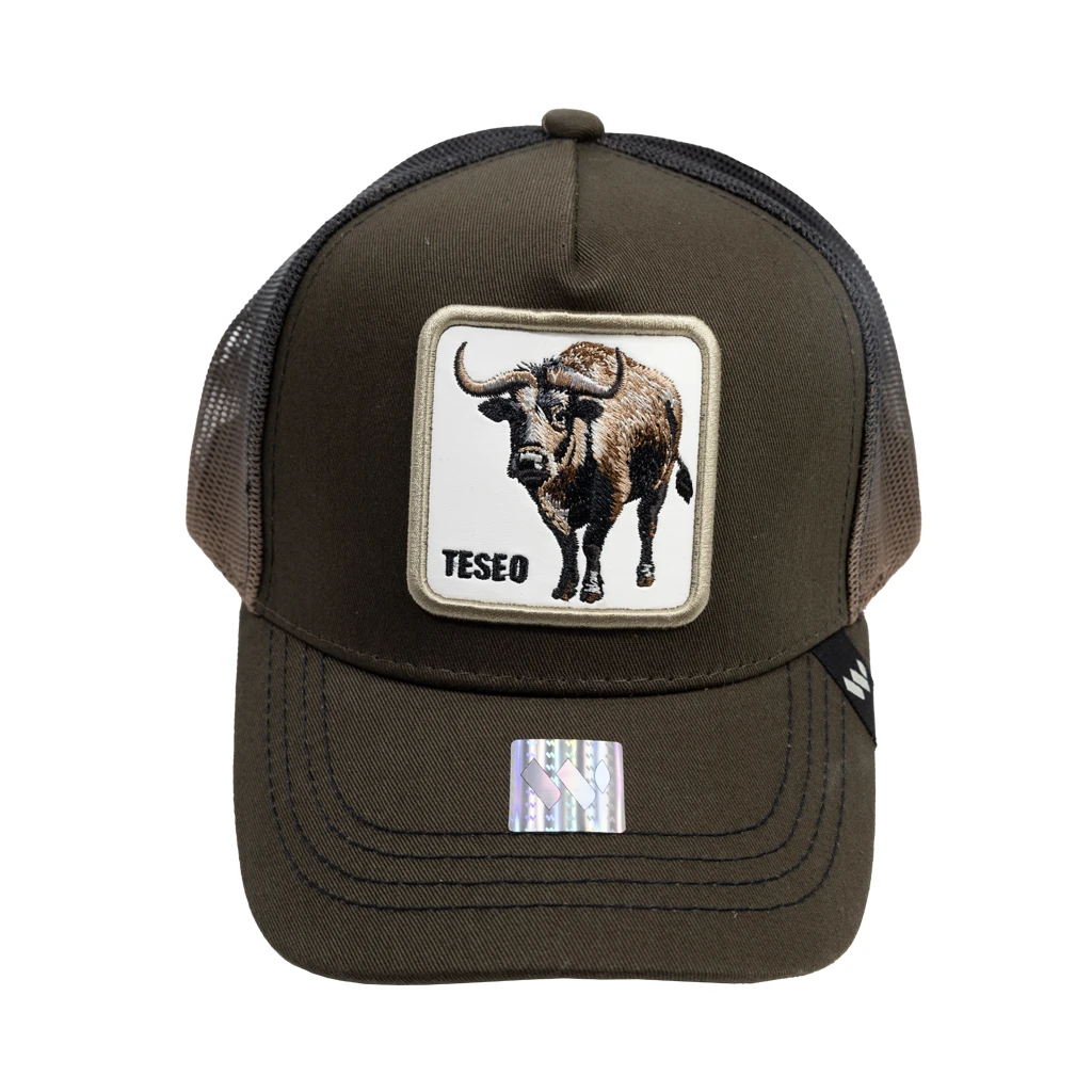 La gorra es un modelo tipo trucker con la parte frontal en color marrón y la parte trasera de malla negra con un ligero degradado hacia marrón. En el panel frontal destaca un parche rectangular blanco con la imagen de un toro y la palabra “TESEO”. Su diseño combina un estilo rústico, fuerte y llamativo con la comodidad y ventilación típica de las gorras de malla. La visera es curva y presenta costuras visibles en contraste que añaden detalle estético.