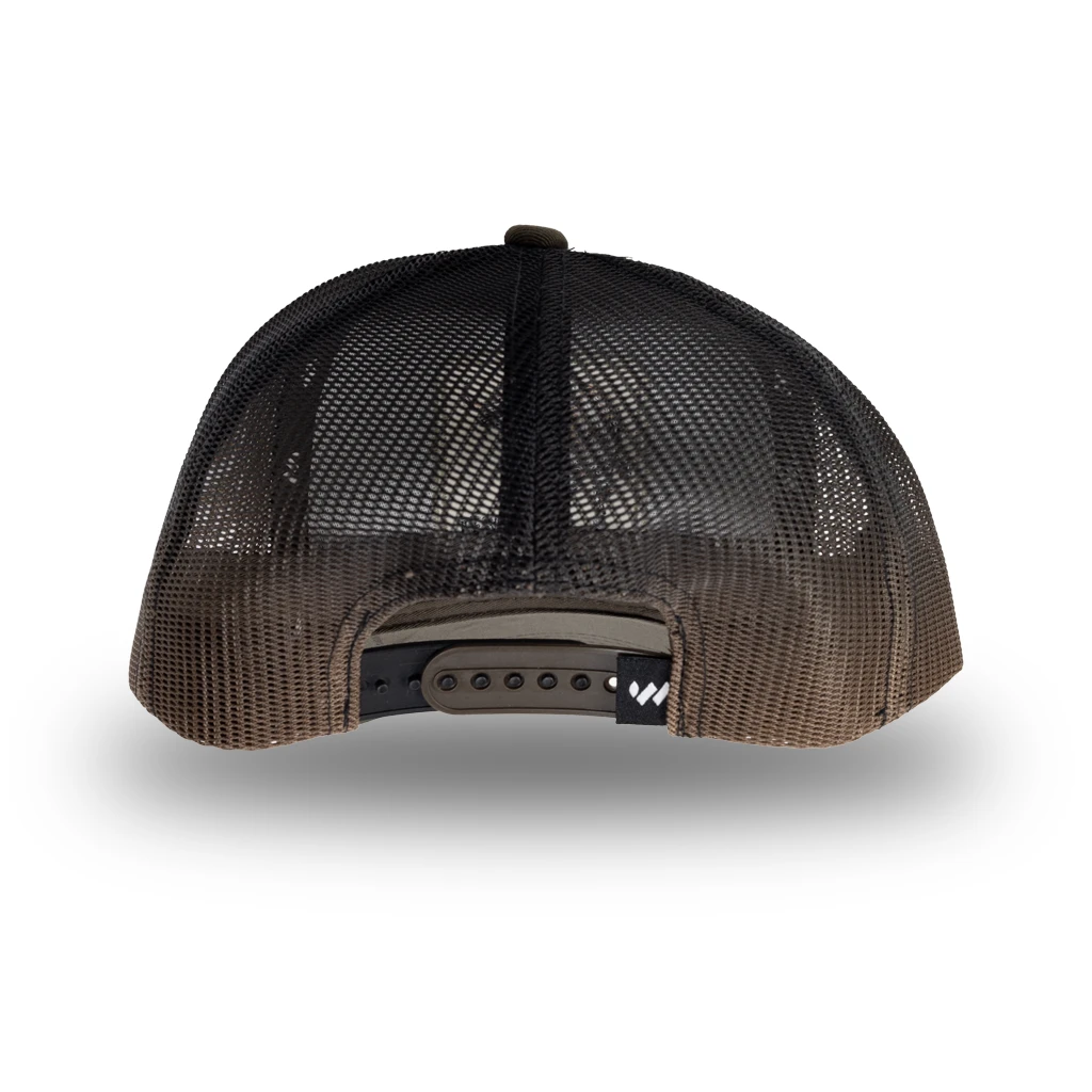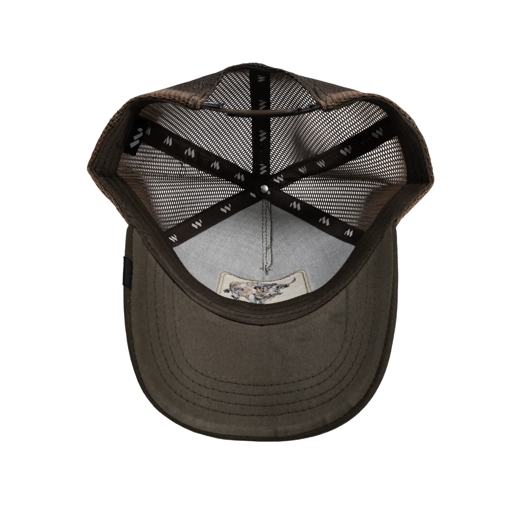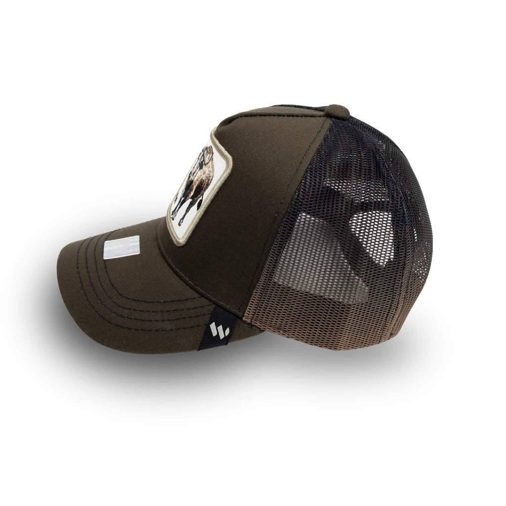La gorra es un modelo tipo trucker con la parte frontal en color marrón y la parte trasera de malla negra con un ligero degradado hacia marrón. En el panel frontal destaca un parche rectangular blanco con la imagen de un toro y la palabra “TESEO”. Su diseño combina un estilo rústico, fuerte y llamativo con la comodidad y ventilación típica de las gorras de malla. La visera es curva y presenta costuras visibles en contraste que añaden detalle estético.