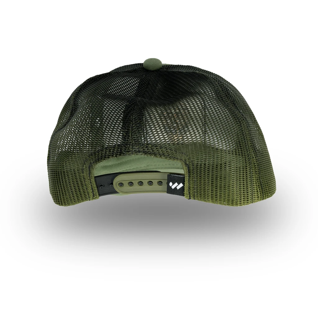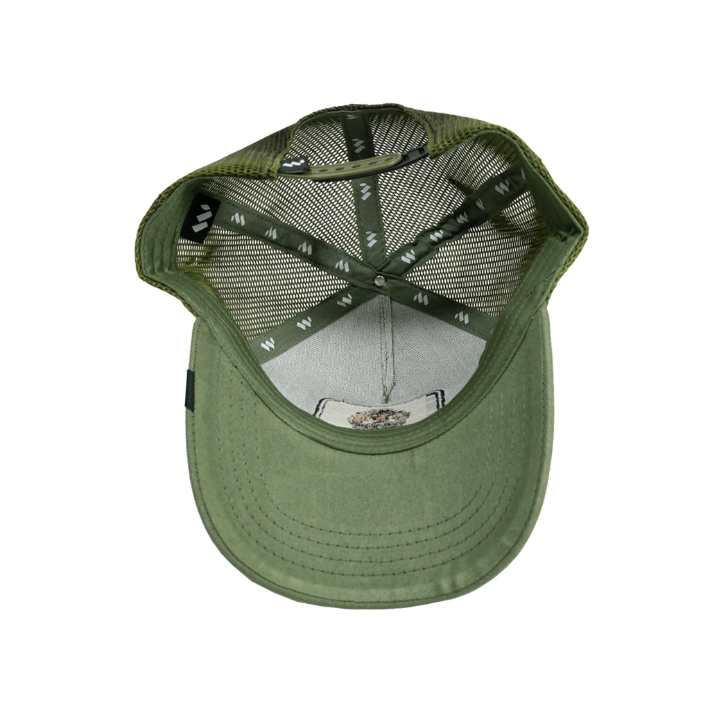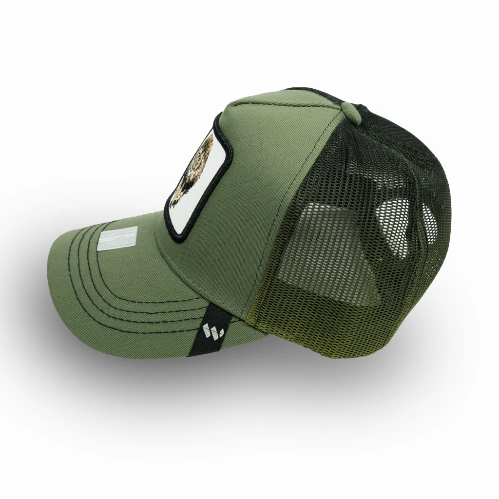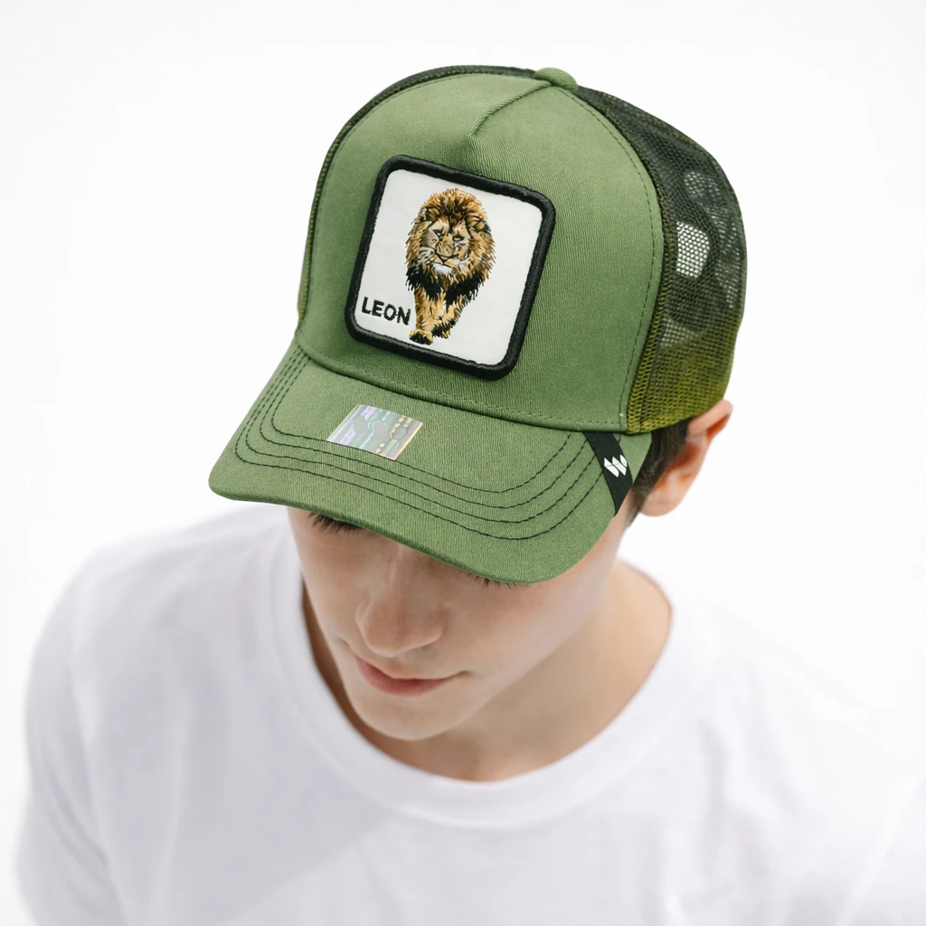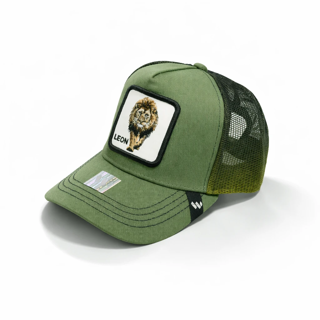 La gorra es un modelo tipo trucker con un color verde militar en la parte frontal y en la visera. En el panel frontal lleva un parche rectangular blanco con la ilustración de un león y el texto “LEON”. La parte trasera está fabricada con malla en tonos oscuros con un ligero degradado hacia verde, lo que aporta ventilación y estilo. Su visera es curva, con costuras visibles en contraste y un diseño moderno y llamativo.