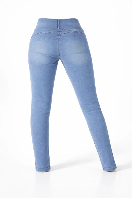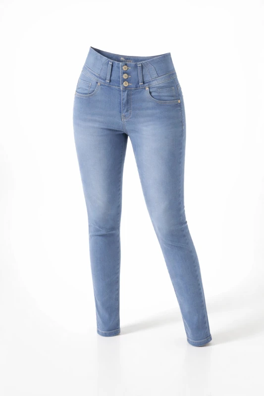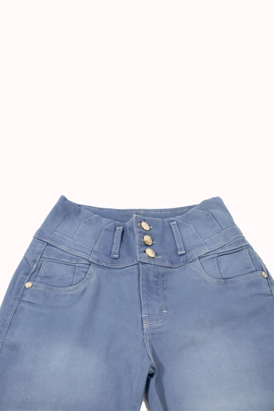 Este pantalón de mezclilla en color azul claro destaca por su diseño moderno y favorecedor. Su tiro alto ayuda a definir la cintura y aporta una silueta estilizada, mientras que su corte ajustado tipo skinny se adapta cómodamente a las piernas, brindando un look elegante y actual. El tono claro del denim le da un aire fresco y versátil, perfecto para usar durante el día o en ocasiones casuales