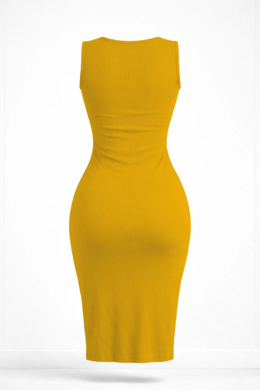 Este vestido femenino destaca por su diseño elegante, sofisticado y atemporal. Confeccionado en un tono mostaza, resalta la silueta gracias a su corte ajustado tipo bodycon que se adapta al cuerpo de forma favorecedora. Su largo midi aporta equilibrio entre sensualidad y distinción, convirtiéndolo en una pieza ideal para eventos formales, cenas especiales o reuniones elegantes.