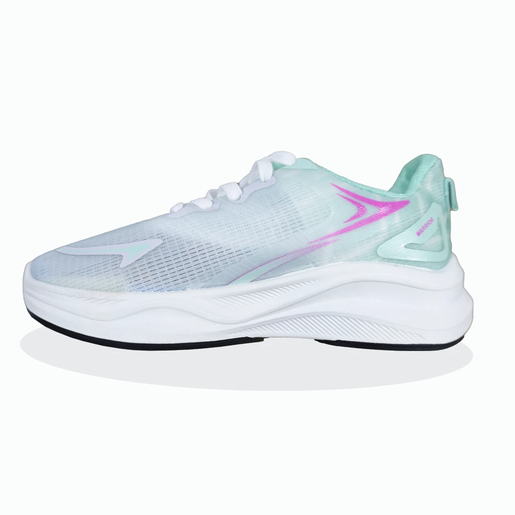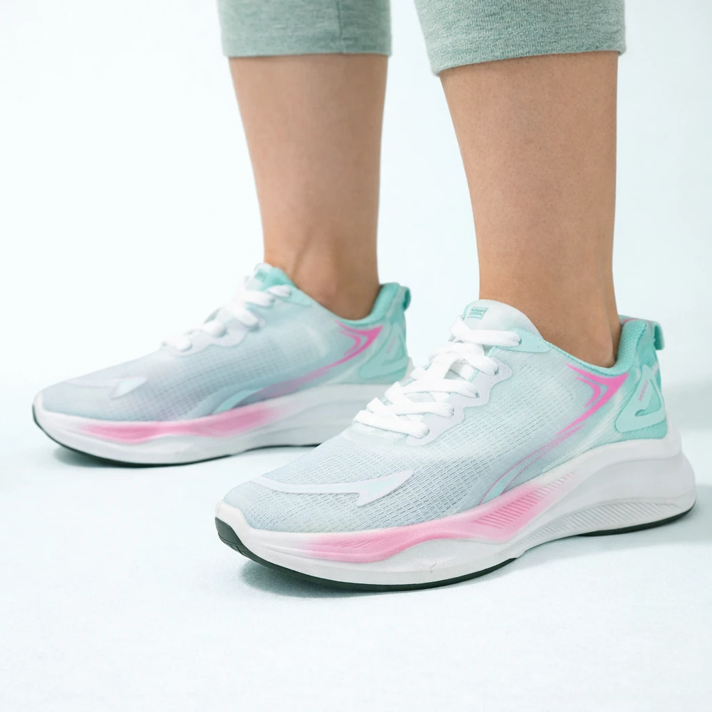 La parte superior presenta un diseño liviano y transpirable que ayuda a mantener el pie fresco durante el uso prolongado. Su estructura se adapta al movimiento natural del pie, ofreciendo sensación de libertad sin perder sujeción. Los refuerzos estratégicos aportan estabilidad, mientras que la suela de gran volumen brinda una pisada más cómoda y con mejor absorción del impacto