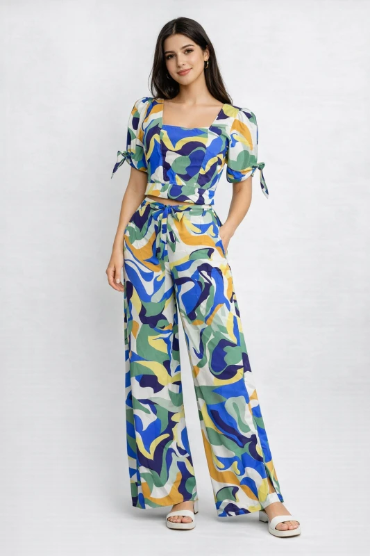 Este conjunto femenino de dos piezas combina frescura, estilo y comodidad en una propuesta versátil y sofisticada. Su estampado abstracto en tonos verdes, azules y mostaza aporta un aire artístico y contemporáneo, ideal para mujeres que buscan destacar con elegancia. El diseño equilibra un top estructurado con pantalón de pierna amplia, creando una silueta estilizada y fluida perfecta tanto para el día como para ocasiones semi-formales.