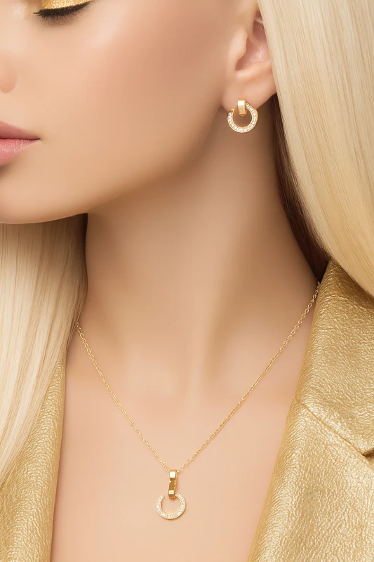 Los aretes replican el motivo semicircular del dije, manteniendo proporción y continuidad estética. Su tamaño reducido y su fijación segura permiten un ajuste cómodo al lóbulo, asegurando estabilidad durante el uso prolongado. El acabado dorado pulido refuerza la lectura de lujo discreto y facilita la versatilidad del conjunto para distintos contextos de uso.