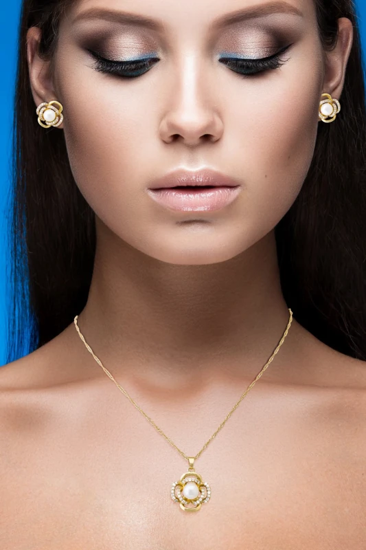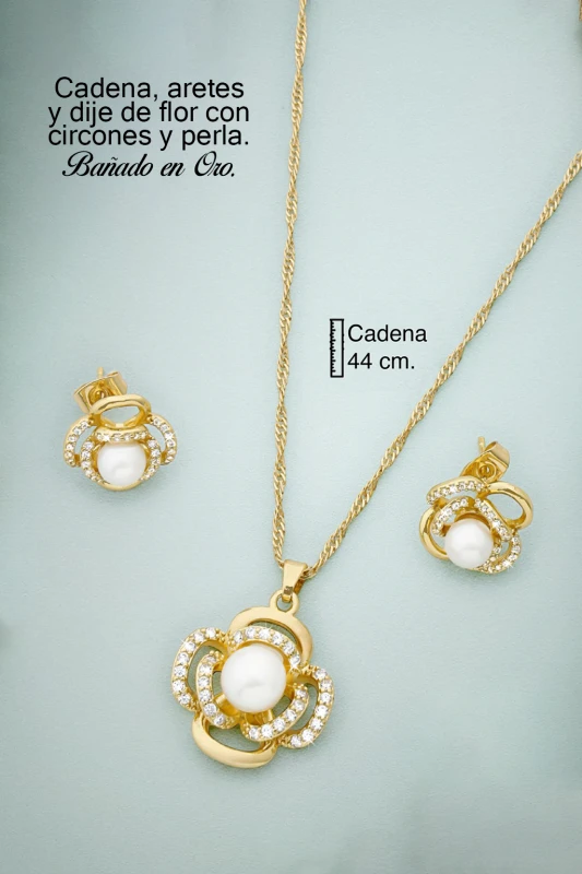 Este elegante set de joyería combina sofisticación y brillo en un diseño armónico. El conjunto incluye un collar con cadena dorada y un dije ornamentado, acompañado de un par de aretes a juego. Cada pieza destaca por una perla central de acabado suave y luminoso, rodeada por un delicado marco dorado adornado con brillantes cristales que añaden un toque de lujo. Su estética clásica y refinada lo convierte en un accesorio ideal para ocasiones especiales, eventos formales o para complementar atuendos elegantes con un toque distinguido y femenino.