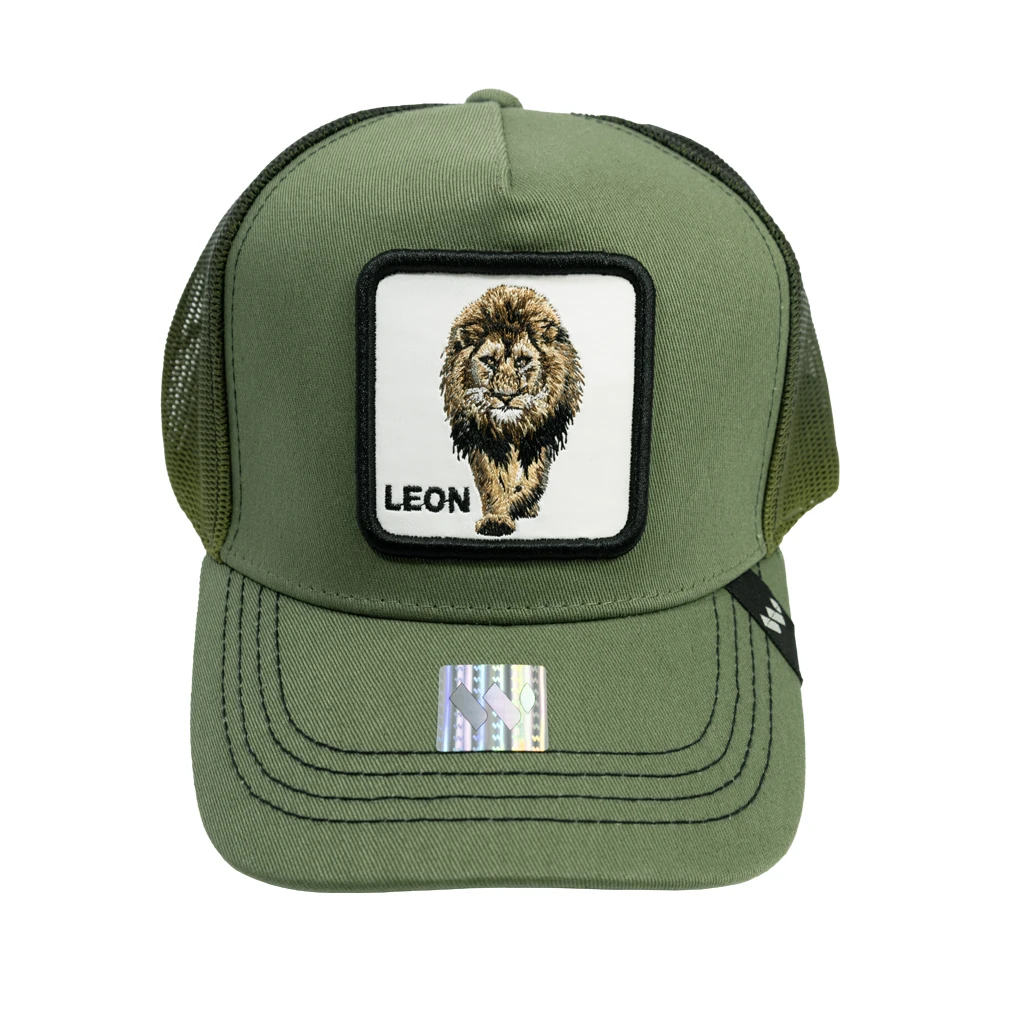 La gorra es un modelo tipo trucker con un color verde militar en la parte frontal y en la visera. En el panel frontal lleva un parche rectangular blanco con la ilustración de un león y el texto “LEON”. La parte trasera está fabricada con malla en tonos oscuros con un ligero degradado hacia verde, lo que aporta ventilación y estilo. Su visera es curva, con costuras visibles en contraste y un diseño moderno y llamativo.