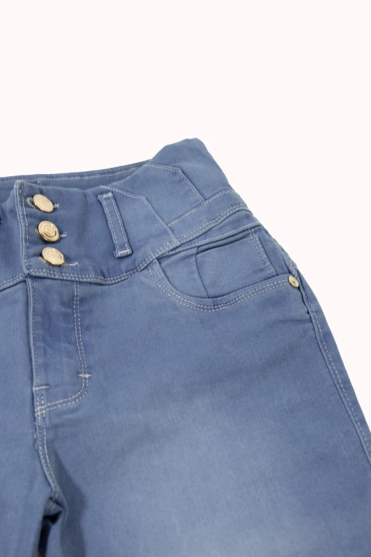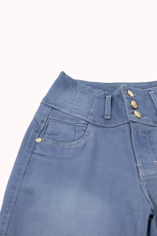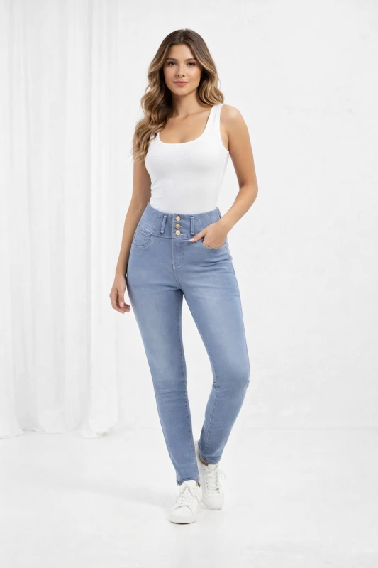 Este pantalón de mezclilla en color azul claro destaca por su diseño moderno y favorecedor. Su tiro alto ayuda a definir la cintura y aporta una silueta estilizada, mientras que su corte ajustado tipo skinny se adapta cómodamente a las piernas, brindando un look elegante y actual. El tono claro del denim le da un aire fresco y versátil, perfecto para usar durante el día o en ocasiones casuales