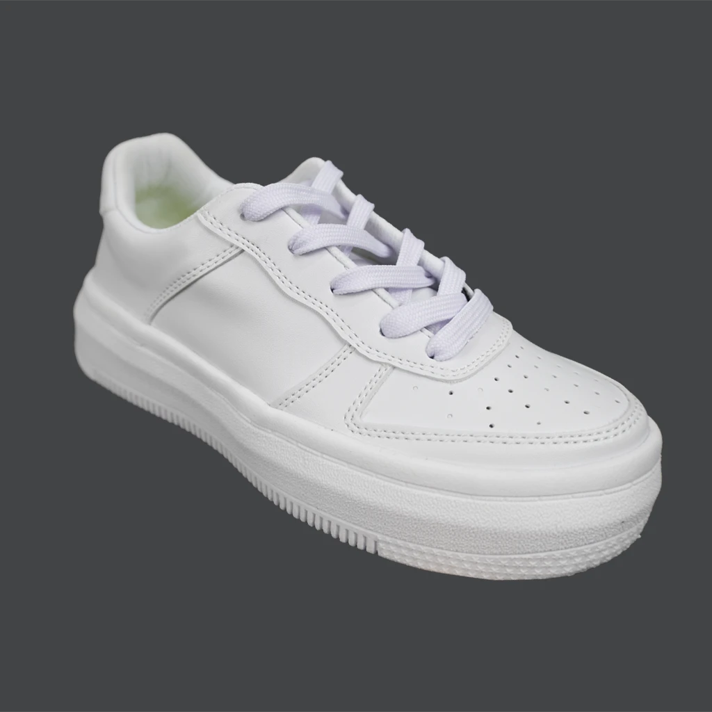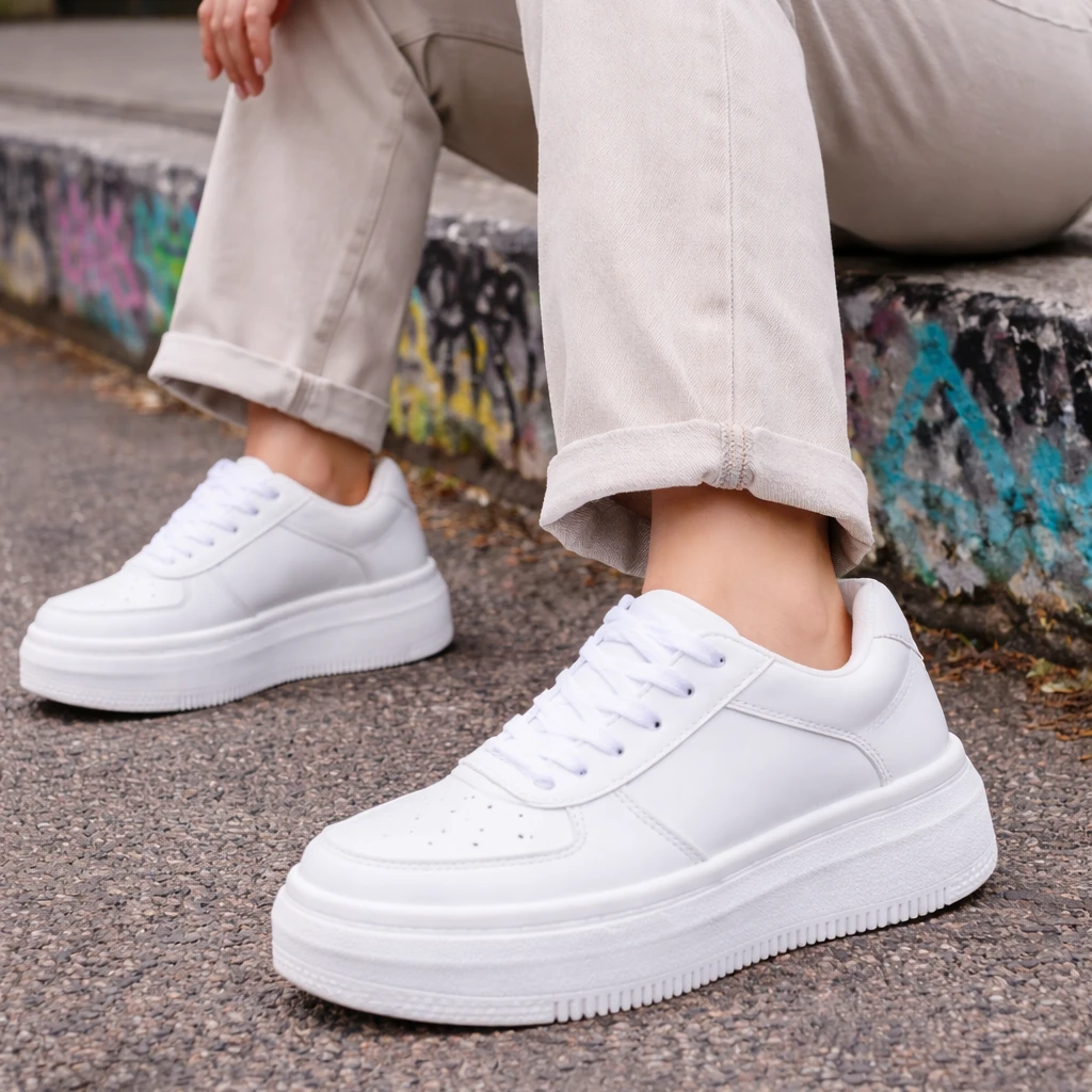 Zapatillas urbanas blancas de estilo moderno, diseñadas para brindar comodidad, versatilidad y un look minimalista que combina con cualquier outfit. Su diseño de suela gruesa tipo plataforma aporta mayor altura y confort al caminar, mientras que el acabado liso en color blanco las convierte en el complemento perfecto para looks casuales, urbanos o deportivos. Ideales para uso diario, estas zapatillas ofrecen resistencia, estilo y comodidad en cada paso.